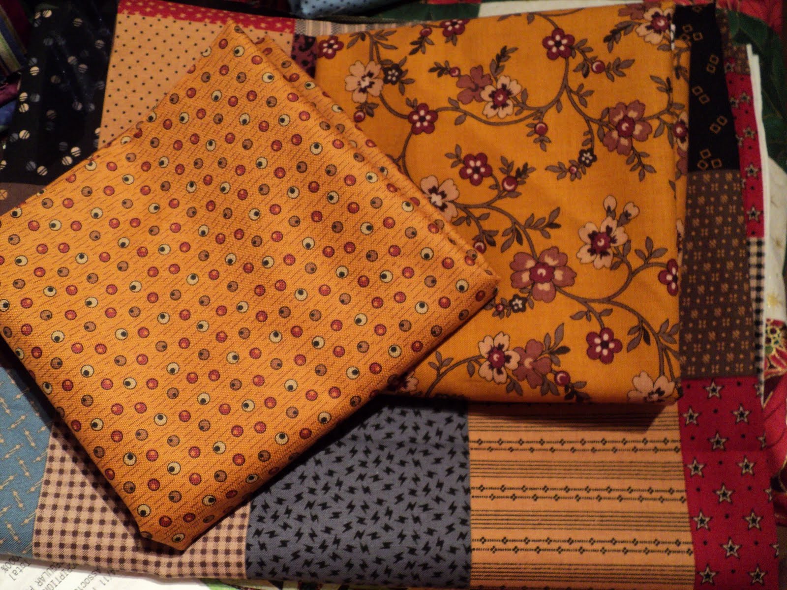 Underneath these cheddars you can see the yard of backing fabric I bought. I love the cheater cloth stuff for my backings and I think this one will go on the back of the Bread and Butter quilt I prepped today.
